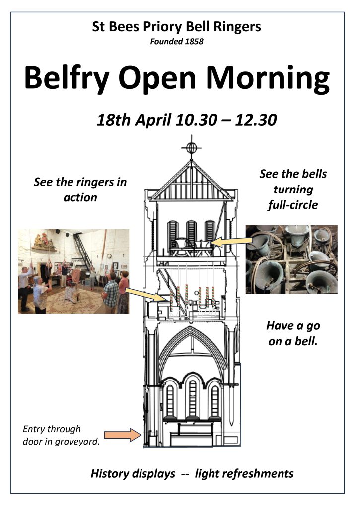 On the morning of the AGM, the Belfry at St Bees will be open from 10.30am-12.30pm. There will be a displays; visitors will be able to see ringers in action and see the bells turning full-circle. And if they want, they can have a go on a bell.