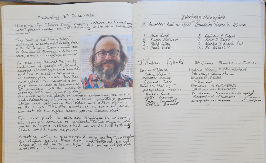 For our part the Bellringing Motorcyclists rang from 2pm, starting with Stedman and then concluding with an excellent quarter peal of Grandsire Triples that finished about 3.10pm. Their bikes lined up outside the church got everyone in the mood for what was to come when the main procession arrived in Barrow. With a brief break in the middle for refreshments including a Hairy Bikers recipe banana loaf with walnuts (and lots of other food treats – thanks to all that donated) we had open general ringing from 3.15pm to 5pm. We expected to finish after the last bike arrived, but they were still coming an hour later! … but at least this gave the ringers a chance to join the massed motorbikes in the centre of town. It was great to ring in tribute to Dave Myers – Barrovian and real ambassador for the town, and everyone seemed to be in such a positive frame of mind just like Dave had always been. Thanks to the biker community, and especially Si King, Woody, and of course Dave’s wife Liliana. RIP Dave Myers (8th Sep 1957 to 28th Feb 2024).